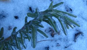 Our rosemary bush is the most hardy and helpful plant in the raised bed below our deck. Even covered in ice, I could smell our rosemary’s sweet fresh woody scent and see its deep green needle-like leaves. It flourishes in cold icy winters and hot dry summers. During the summer its pungent scent repels deer and mosquitoes. I am convinced that deer do not come to our garden and eat our figs and daylilies because our rosemary bush is planted at the edge of the raised bed.