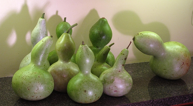 We picked all our gourds today even though it is best to pick the gourds later in the season when the stems turn brown. We picked them early because many of them had developed dark green and brown spots. The Home and Garden Center at the University of Maryland Cooperative Extension thought the spots were water soaked spots due to our very wet growing season. They could not identify any fruit pathogen from the photo I sent to them. They recommended we pick the gourds immediately, rub them with a mild bleach solution and let them air dry. Now we have some sparkly clean gourds.