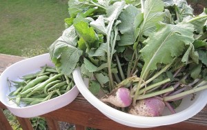 I sauteed a bunch of turnip greens with garlic in olive oil, but they were too bitter to eat alone. The greens tasted better in chicken pasta soup. I am certain I can get my husband to try the greens again if I combine them with bacon. We’ll see on the next fall harvest.