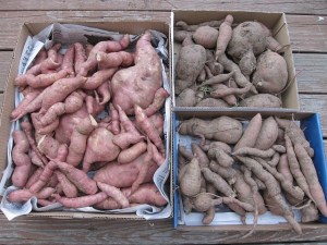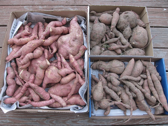 We dug out 30 pounds of sweet potatoes last Sunday. They were smaller than last year’s crop. We wonder if its because we did not cover the ground with black plastic this year. The plastic keeps the soil warmer and prevents over-watering from flooding rains. We will use the black plastic next year. |