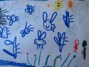 My son's garden dreams include bugs and three suns (can you see them at the top right?)