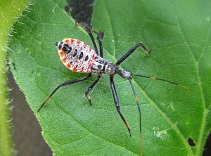 The pest bugs in our garden – squash bugs, flea beetles, Colorado potato beetles and others kept this Assassin Nymph well fed! I found the nymph about 4 weeks ago on an eggplant leaf. Yesterday, I found two mature Assassin bugs. I recognized them by their long hooked beaks and agile legs. Last year, my son found an Assassin bug nymph. I wrote a post describing how we identified it. This year is the first time we found a mature Assassin bug. It is hard to miss these fierce bugs. They resemble a prehistoric animal with its spiky hump and bronze oval mark on its back. The Assassin bug waits for insects then stabs them with its proboscis (the beak) and injects them with a toxin. Its bite is very painful to humans. I am glad for organic help to remove the bad bugs from our garden plot, but I will keep my distance!