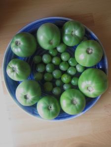 Plants with branches slumped and sticky hold plump cherry and grape tomatoes in our kitchen garden. The full sunny days and shower refreshed evenings kept all growing. Over four feet in two months! Our tomato plants grew beyond their cages and almost touched the deck before they toppled on themselves as vines will do. We gave string and stake support a little late. We did not anticipate such rapid growth so they kind of went a little wild beyond their cages. They needed a supported space – a ring of rope to grow up into.