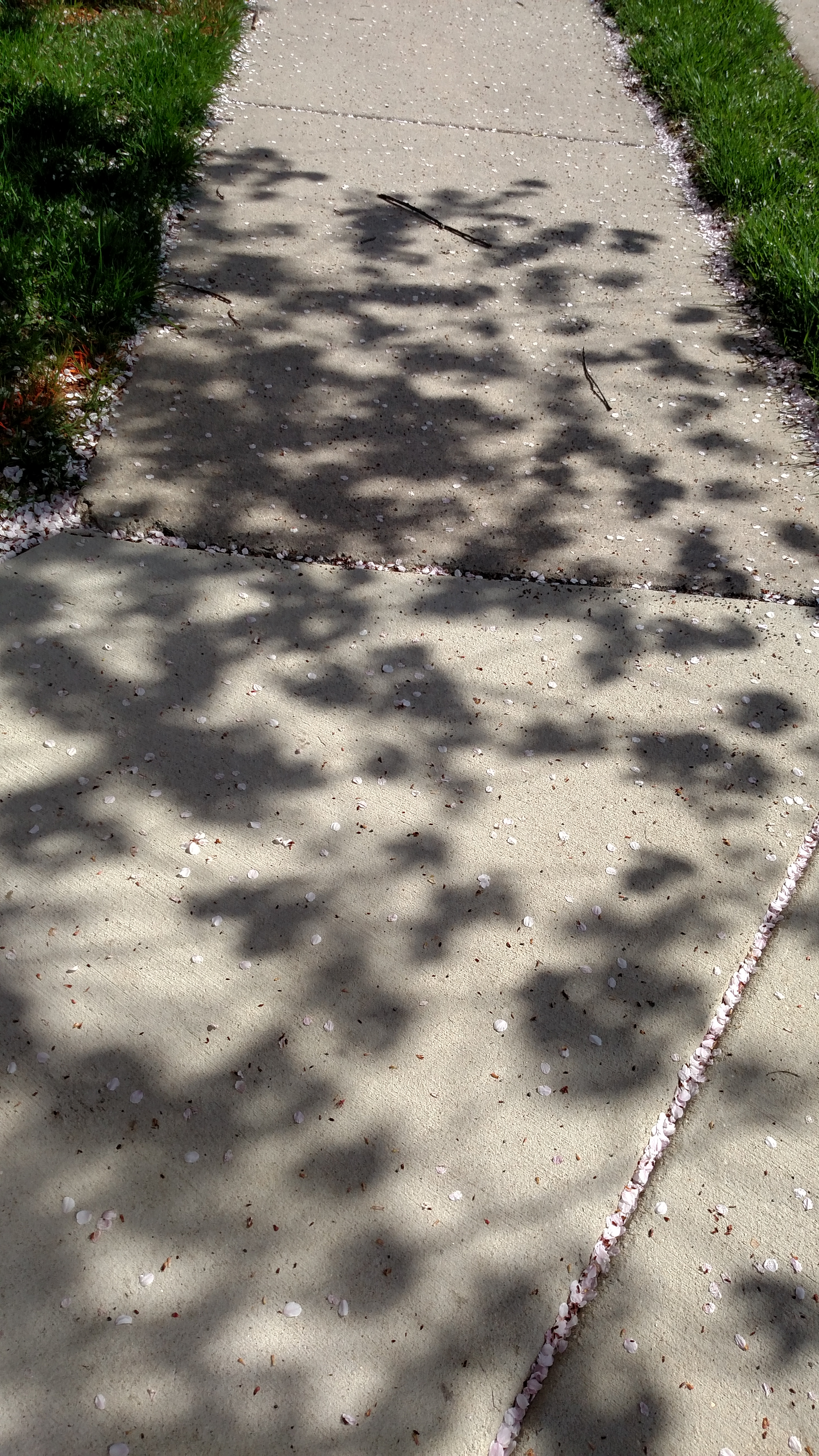 Bright sun, vibrant color and sweet scents surround me. I walk in Spring beginnings. The white and pink flowering trees are splendid. I stop and gaze below me. There is another beauty here with a dance that reveals the secret rhythms of light and wind. It softens the sun’s sharp edges. It shelters. It is not a brief burst of Spring color. It will grow through summer. I stand inside the hidden beauty of a Spring Shadow.