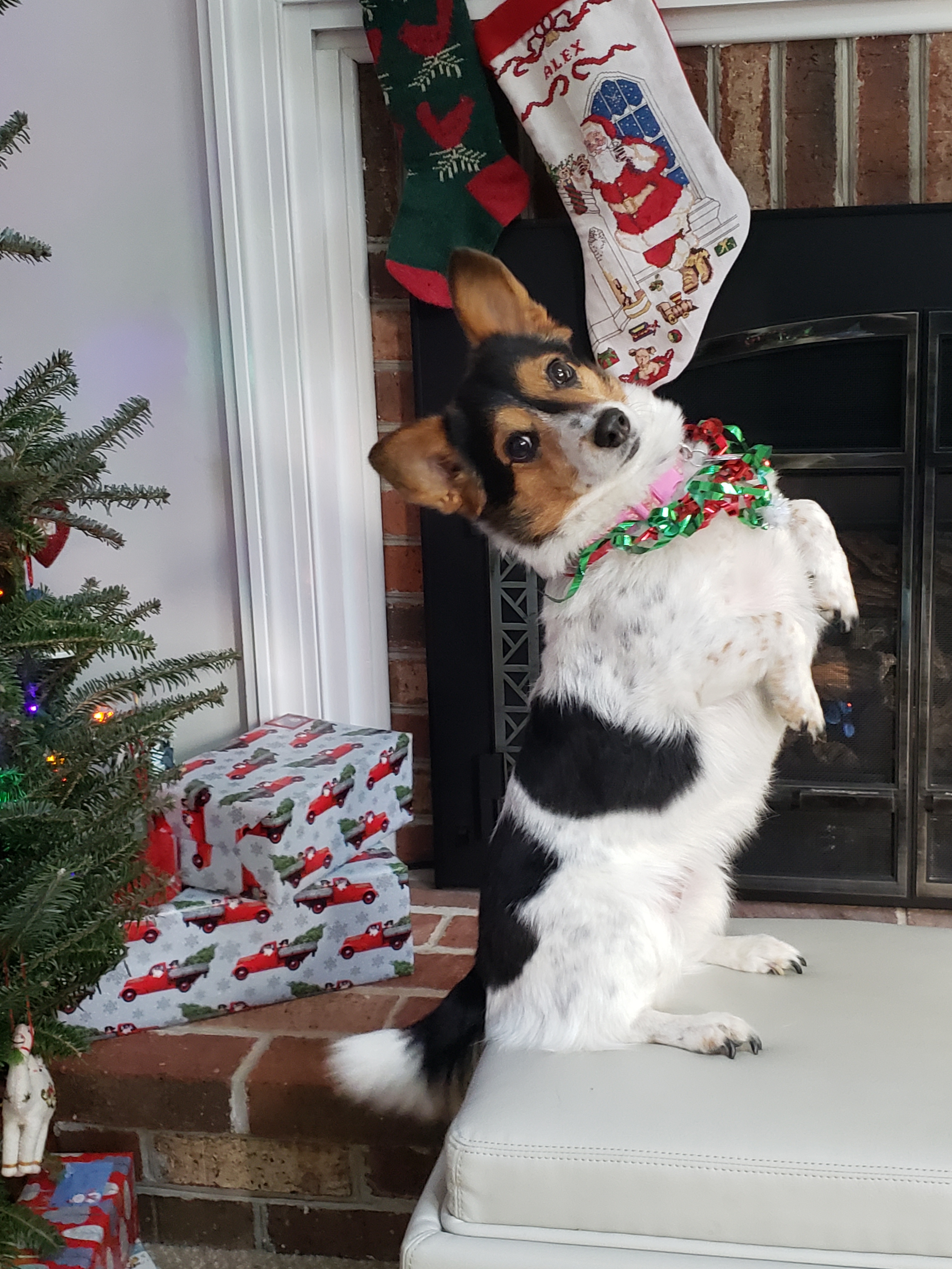 My guardians took me to a Behavior Vet. I was diagnosed with FAS (Fear, Anxiety and Stress). My guardians give me medication to help, but the best thing that works for me is Scent work. I need to work so I love to search for treats hidden in towels, boxes and containers and even the blanket my mom knitted for me (see photo). I also, like to do tricks for treats. I am proud of my Christmas photo 2021. Here I am doing a “sit pretty” for a treat.