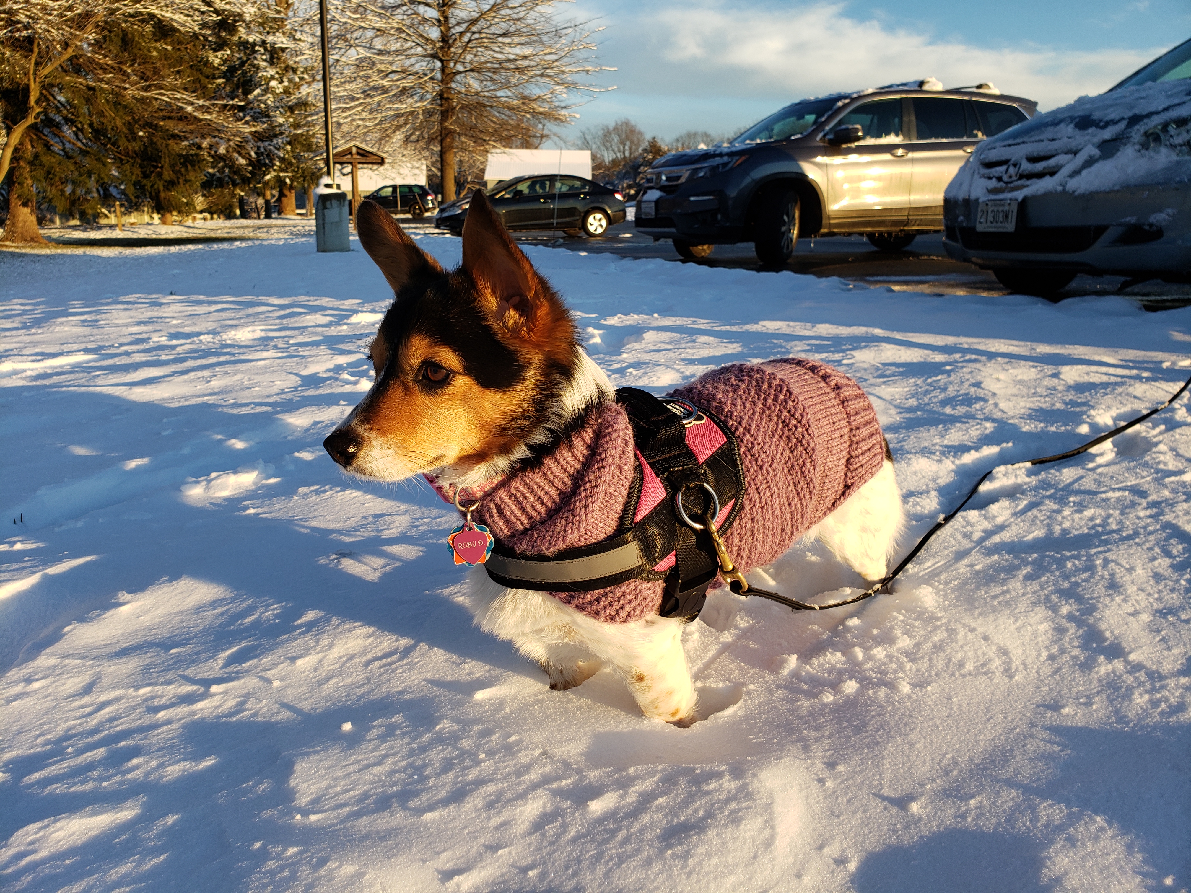 My prefered place to walk and sniff is Howard County Conservancy. I still do not like to walk in our neighborhood. There are trucks, large lawn mowers and loud tree branch eaters on our street. There are things that scare me in our neighborhood. I wish I could tell my guardians exactly what makes me fearful when I walk on the sidewalk. I don’t mind when my dad guardian carries me while they walk on the sidewalk. I am glad my guardians give me treats when we walk outside. When I do a trick for a treat it takes my mind off the scary emotions I am feeling.