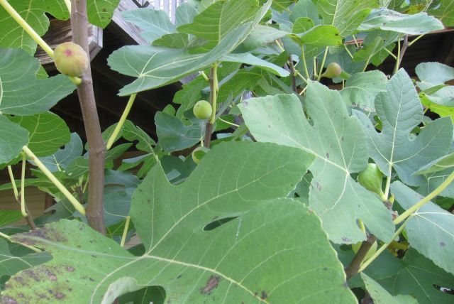 Can you find 6 green unripe figs? Figs develop on new growth at base of leaves, not at a flower because the blossom is inside the fig!