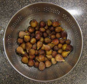 hot peppers, sweet potato leaves and eggplantThis week we planted more than we harvested. We planted turnips, beets, broccoli, brussel sprouts, kale, radishes and several kinds of leaf lettuces. We pulled out the last of our tomato plants and one pepper plant. Our gourd and sweet potato vines are spreading everywhere. We picked bags of sweet potato leaves. I plan to lightly saute the leaves, put them into quart size bags and freeze. I made a tasty Asian rice noodle soup with the sweet potato leaves. The leaves are thick enough to hold up well in soup. cut figs