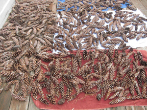 Drop the washed pine cones on a tarp, shake them a bit then place them on a towel to dry. Let the pine cones dry outside for one to two days. The pine cones close when they are wet. They are ready for wreath making when they start to open.