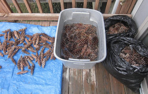 First, gather the pine cones from the ground in your yard, neighborhood and parks. The long thin pine cones work best. Next, wash the pine cones by swishing them around for a few minutes in a large bin of water mixed with a quarter cup of bleach