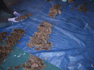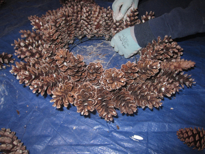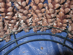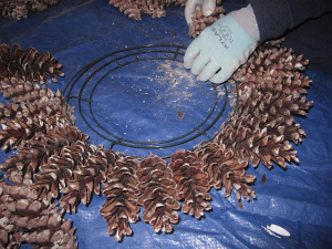Place a large tarp on your floor work space. Sort the pine cones by size: small, medium and large (wear gloves and old clothes since there is still sticky sap on the pine cones). Pinch off the small stems at the base of the pine cones. The pine cones are ready to go into your 12 or 16 inch metal wreath form.
